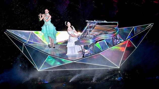 开幕式在空间叙事、艺术表达等方面都体现了三地文化交融。主舞台直观呈现“同心圆”造型,环形舞台周边是广阔的水面,运用前沿的“虚实结合”技术,让珠江、维多利亚港、伶仃洋的水波在场地中交汇奔流。这不仅是地理水系的相连,更是三地同源共流的文化血脉与手足亲情的象征。粤港澳三地火炬手共同点燃主火炬装置,将开幕式气氛推向高潮。
