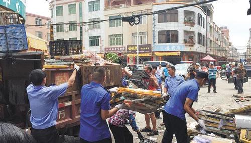 当天上午,该镇主要负责人带领全体干部职工以及相关职能部门和镇区各村(居)干部100多人,兵分多路,出动挖掘机4辆、铲车2辆以及多辆垃圾运输车,对市场周边各门店占道经营的货物、摊架、非公益性广告横幅、挡雨棚和“三鸟”摊档进行清理和拆除。搬移沿街堆放的障碍物,清走路边乱扔乱倒的大件杂物,整顿主干道乱停乱放的车辆,规范农贸市场菜档摆放和调配,全方位清理镇区范围内的卫生死角,并对沿街占道经营的业主进行执法劝导。