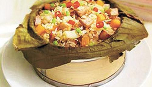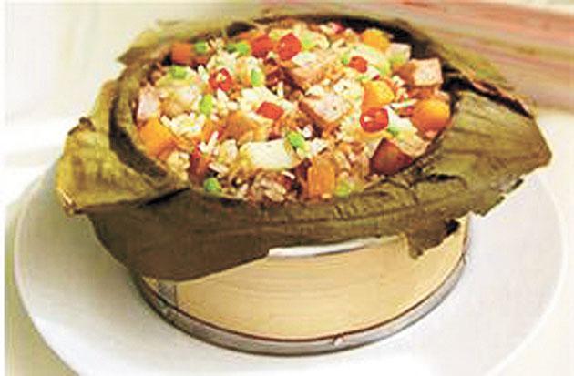 新鲜荷叶中和了炒饭的“热气”,相比起用荷叶包裹上笼蒸熟的荷叶饭,这样焗出来的饭,荷香更甚;炒饭的内容不限,你能想到的,你所喜欢的,就算是普通的鸡蛋炒饭,用荷叶包了焗一下,都会有特别的风味。