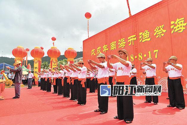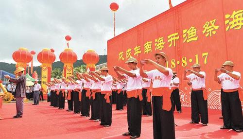 “征鼓阵阵,龙旗猎猎,古港闸坡,千轮待发。谨把酒祭酹,深愿风平浪静,锦鳞郁勃,鱼翔虾跃,生生不息,助我邑民,振我渔业……”