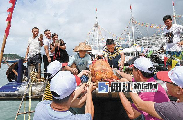 扬帆出海前,渔民们举行了庄严的祭海仪式,用古老的仪式虔诚敬天、敬地、敬海。金猪、水果、茶酒……净手献祭,螺号齐鸣,告天地万物,祈盼耕海征程一帆风顺、平安吉祥,祈盼生生不息的大海能给他们带来丰厚的物产。