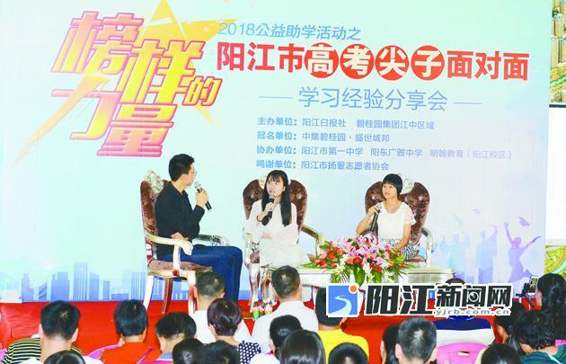 阳江日报讯(记者/刘云鹏)每年高考放榜后,总有一批“别人家孩子”的优秀成绩羡煞众人,成功绝非偶然,光环的背后是勤奋和诀窍的双重加持。22日下午,2018阳江市高考尖子学习经验分享会在阳江中集碧桂园·盛世城邦举行。我市文、理科4名高考尖子生分享高分秘笈、畅聊生活爱好,两名优秀一线高中教师讲述教学经验、分析高考试题趋势,让现场学生、家长收获满满。活动期间,本报新媒体通过视频全程直播活动,全方位展示分享会精彩场景,截至活动结束时有5.7万多人次观看直播。