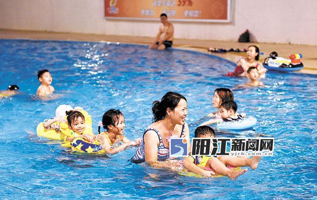 4日晚,市水上活动中心,家长带小朋友在游泳池里玩耍。宋福亮 摄