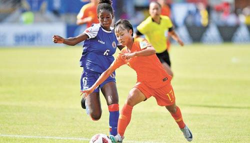 中国队球员张琳艳(右)与海地队球员杜·约瑟夫在比赛中拼抢。新华社发