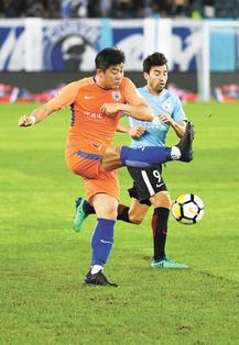 山东鲁能泰山队球员崔鹏(左)在比赛中拼抢。新华社发