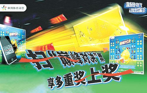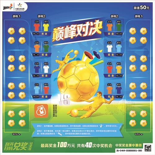 此次促销活动,主要针对新上市的“顶呱刮”系列即开型体育彩票的全民健身主题新票“巅峰对决”(右图为样票和宣传海报)。此款新票在票面设计上具有较强的足球比赛氛围感和画面感召力,玩法简单不失趣味性。彩票面值50元,最高奖金100万元,一张彩票有多达40次的中奖机会,带给购彩者超值的游戏体验。“巅峰对决”票面设计色彩清新、靓丽,扫描票面上的二维码,还可观看足球运动视频,彩票背面还附有欧洲五大联赛信息及竞彩玩法小知识。