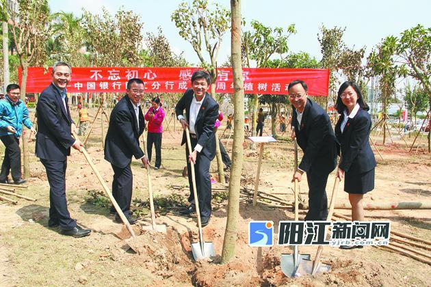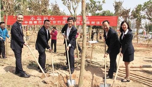 阳江中行班子成员(从左到右分别为:副行长林哲汀、副行长林文理、行长刘昕、纪委书记李智奇、副行长陈少英)与全体中层干部一起参加义务植树活动。