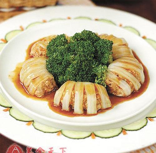 将香姑洗净切碎,和猪肉馅放到一个大碗内,加入盐、鸡精、酱油、料酒各适量进行调味并搅拌均匀。锅中烧开水,把大白菜放进去焯软,取出沥干水分,晾凉。用刀在大白菜帮比较宽的那一段,从大白菜梗中间均匀地划4刀,内侧朝上,放上馅料。把大白菜帮折成佛手形状,倒扣在盘中,依次把所有的大白菜帮都做成佛手形状。锅中烧水,放锅上蒸15分钟。蒸出后可以稍加装饰,就可以上桌了。