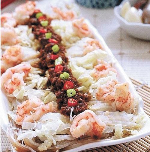 粉丝提前用冷水泡软备用;大白菜洗净,切成细丝;虾仁横剖成两半;大蒜捣成蒜蓉备用。将泡好的粉丝铺在盘中,上面均匀地码上大白菜丝,然后放入虾仁备用。炒锅中倒入植物油烧热,下蒜蓉爆香,倒入鱼豉油煮滚。将调好的蒜蓉豉油汁浇在大白菜上,然后将大白菜放入蒸锅中,开锅后4至5分钟即可,吃的时候稍微拌一下。需提醒的是,豉油汁和大蒜的用量可根据个人口味适当调整;大白菜切丝后很容易熟,所以蒸的时间要掌握好。