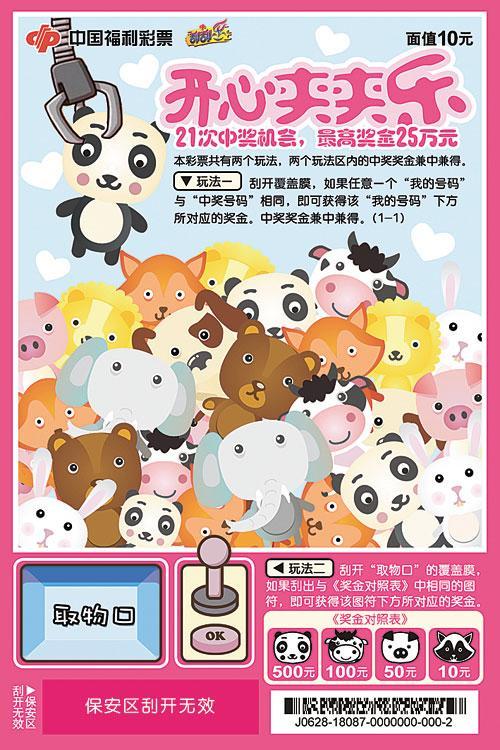 近日,又有一款刮刮乐新票在我市上市。“开心夹夹乐”是以遍布大街小巷、广受欢迎的抓娃娃机设计而成的一款彩票。画面主体颜色和主题文字以粉红色为主,显得可爱靓丽;票面上摆满了琳琅满目的动物公仔,根据操控娃娃机的技术,其中一只小熊公仔正在被缓缓夹起,将要放入取物口中,整个过程一气呵成,呼应了抓娃娃机的主题,整体性非常强。
