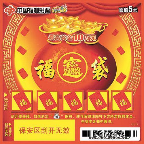 该彩票面值5元,共有9个奖级,最高奖金10万元。寓意美好,销售广泛。采用“固定图符”中奖方式,玩法简单明了,紧扣主题。方便彩民购彩、玩彩。具体玩法是:刮开覆盖膜,如果刮出“”图符,即可获得该图符下方所对应的奖金。中奖奖金兼中兼得。