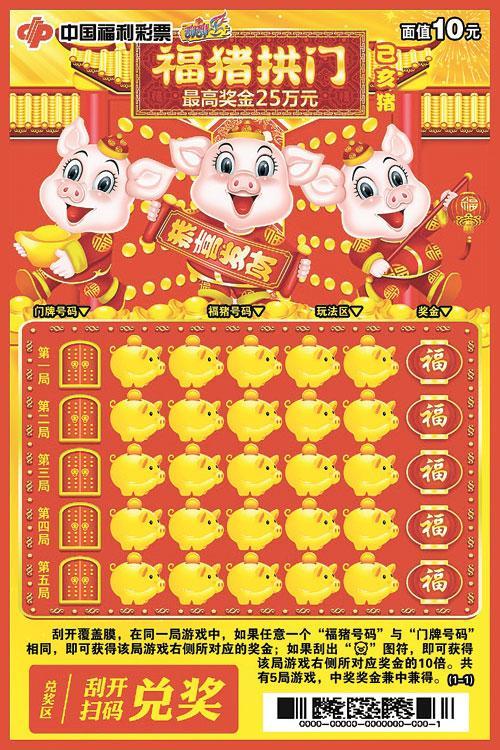 “己亥猪—福猪拱门”是为庆祝己亥猪年而推出的一款生肖纪念票。该款彩票取材于中国传统生肖文化,画面中形体饱满、憨厚可爱的三只福猪造型生动、热闹喜庆。彩票再以玩法区进行总体布局,烘托出红火、欢快的节日氛围,寓意福猪送福运。彩票采用“数字比对+特殊图符”玩法,简单好玩。