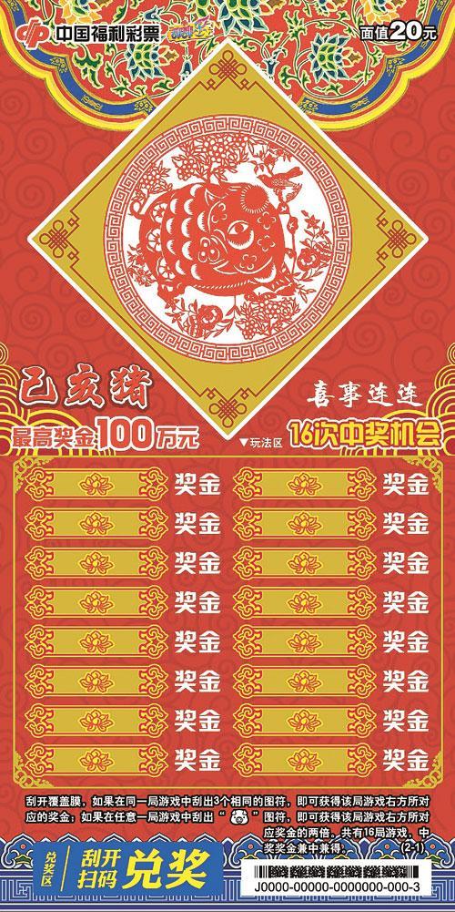20元面值的“己亥猪—喜事连连”的玩法很简单,刮开覆盖膜,如果在同一局游戏中刮出3个相同的图符,即可获得该局游戏右方所对应的奖金;如果在任意一局游戏中刮出“”图符,即可获得该局游戏右方所对应奖金的两倍。共有16局游戏,中奖奖金兼中兼得,一等奖奖金100万元。