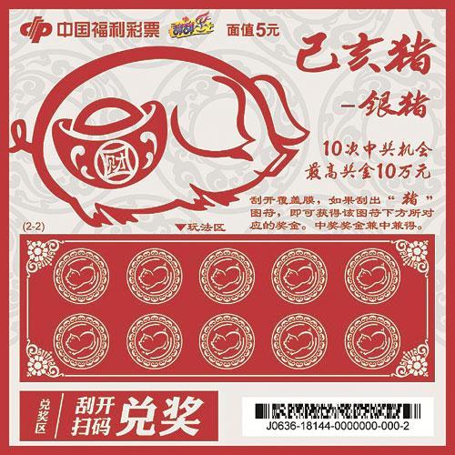 “己亥猪—金猪银猪”是为庆祝己亥猪年而推出的一款生肖纪念票。该款彩票为双联票,分金、银两专色,寓意阴阳平衡。画面背景色选用喜庆吉祥的红色,为广大彩票购买者在新年里送来了喜气与福气;独特的设计构思,使用中国传统吉祥纹样及招财进宝的小猪剪纸形象呼应主题。整张票面体现了我国历史悠久丰富的生肖文化,极具有收藏价值。