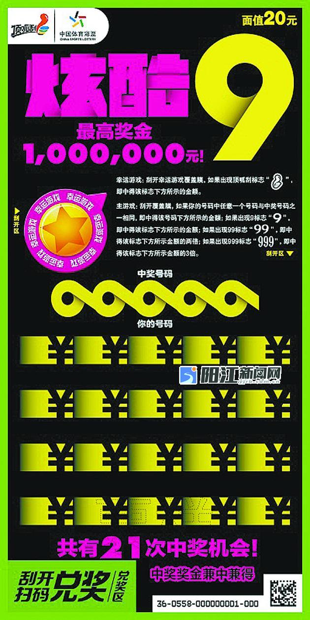 近日,一款既好玩又炫酷的“顶呱刮”系列即开票新票“炫酷9”在全国各地陆续上市销售。“炫酷9”面值20元,一张彩票有多达21次的中奖机会,最高奖金为100万元。买一张彩票来刮一刮,就有机会中100万元巨奖,这就是高面值即开票的魅力所在。