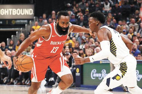 火箭队球员哈登(左)在比赛中带球突破。新华社发