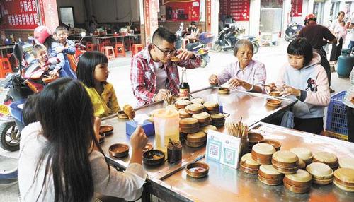 图:合水圩砵仔(米马)摊档前顾客盈门。吴建光 摄