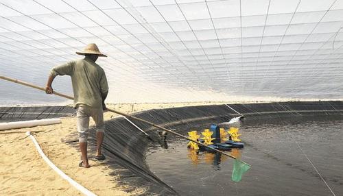 该公司的技术总监黄家映说,这个对虾养殖基地是去年3月开始动工建设的,一期50亩,二期130亩,去年12月投放了12亩共500万尾虾苗,预计亩产达到8000斤以上。他小心翼翼地从虾塘捞出几只对虾,查看它们的生长状况和活动情况,“我们养的是南美白对虾,这种虾最适宜在25至30摄氏度的水里生长。”黄家映一边检查一边介绍,“经过70多天的养殖,这些虾已经长到10厘米左右了,还有十几天就可以全部上市销售了。”