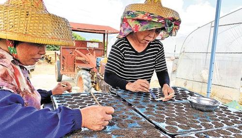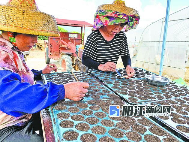 蔚蓝的天空,红火的8月。8月16日下午2时许,记者从国道325线转入县道605线前往阳西县上洋镇那西村。穿梭在乡间小路,不远处便可见几个塑料大棚井然有序地排列着。记者走进大棚,一张简陋的桌子前,有几位戴着草帽的农户左手一只筷子,右手一把勺子,正低头忙着育苗。有的农户把育好的苗放进大棚里,来回穿梭,一片繁忙。