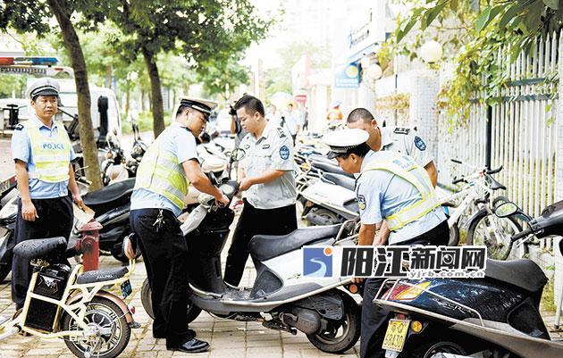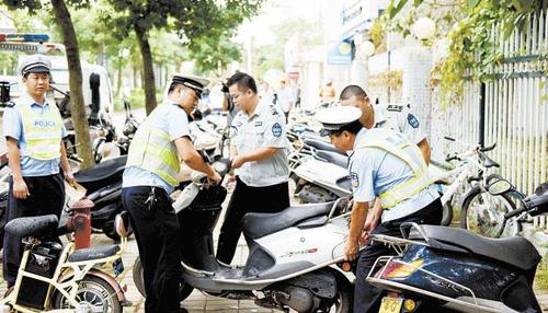 市公安局交警支队执勤民警查扣无牌无证的摩托车、助力车。宋福亮 摄