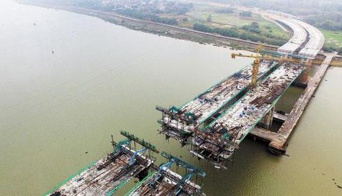 20日上午,记者来到金平路一期工程漠阳江特大桥施工现场,远远望去,两端桥面像是两条长龙横卧在水面之上,高昂龙头相对而视。十几名工人正在北引桥路段铺设钢筋网,下一步将做好焊接作业、混凝土浇筑。在主桥主墩部分,塔吊、汽车吊正在进行紧张作业,工人们在现浇箱梁内绑扎和安装钢筋。项目有关负责人告诉记者,为了加快工程进度,项目施工人员在大年初八已经全部复工,较往年提前了一个多星期。目前,漠阳江特大桥施工现场已集中了100多名工人,主要采取三班倒的轮班制,全力冲刺工程进度。
