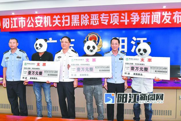 阳江日报讯(记者/刘空 通讯员/阳公宣)27日上午,市公安局召开新闻发布会通报今年以来我市警方扫黑除恶专项斗争成果,展示在收网行动中缴获的赃物和作案工具,还向3名举报涉黑恶犯罪有功群众分别发放奖励金,共计3万元。三名群众戴着“熊猫面具”现场领奖。