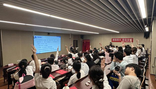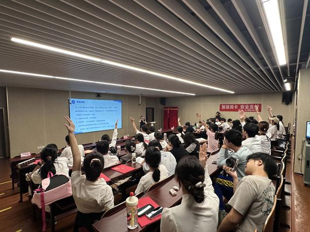 在金融知识宣讲环节,中国银行阳江分行讲师以真实案例为切入点,生动剖析了“校园贷”“刷单返利”“中奖诈骗”等校园高发电信网络诈骗的作案手法与隐蔽陷阱;同时围绕支付安全,结合学生日常用卡场景,讲解了芯片卡防护、密码安全保管、账户盗刷应急处理等核心要点,提醒同学们提高警惕,远离各类支付风险。宣讲过程中穿插的问答互动环节,极大激发了学生的参与热情,大家踊跃抢答,在轻松愉悦的氛围中巩固了所学金融知识。
