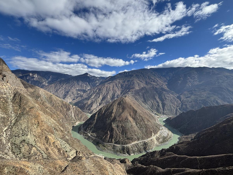 行至中途,我们在一处驿站稍作停歇,这里是金沙江大拐弯观景台。金沙江大拐弯,又称月亮湾、金沙江第一湾,是世界自然遗产“三江并流”区域标志性景观之一。蓝天白云下,金沙江两岸峰峦如涛,连绵的轮廓线勾勒出雄浑的弧度;金沙江蜿蜒其间,似一条碧绿的巨龙在群山间盘旋穿行,形成一个巨大的“Ω”形拐弯,山的巍峨与水的灵动在此交融共生,气势磅礴,构成了一幅壮丽的山水画卷,站在观景台上,可将此番美景尽收眼底。