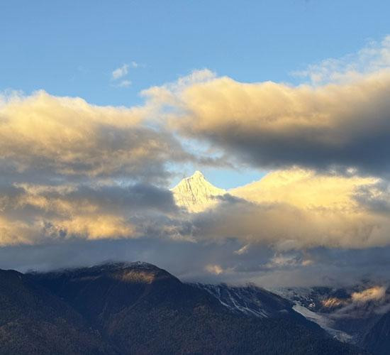 许是神山不忍众人失望,缅茨姆峰悄悄掀开了遮面的云纱。这座被称为“神女峰”的雪山,相传是卡瓦格博的妻子,其线条优美柔和,自带一份温婉坚韧,光芒顺着山坡倾泻而下,为其半遮半掩的身影染上绚烂的金。这份恰到好处的温柔,静静抚慰着游人因雪山能见度低而失落的不安情绪。