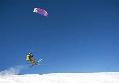 在新疆伊犁河谷东部山区,程鹏在滑行中借助风筝腾空跳跃。