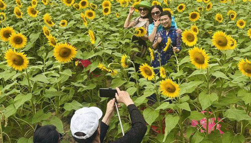 游客在向日葵地拍照。邱悦怡 摄