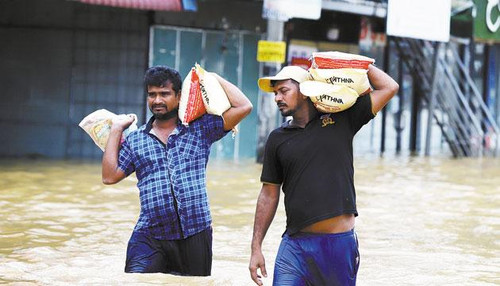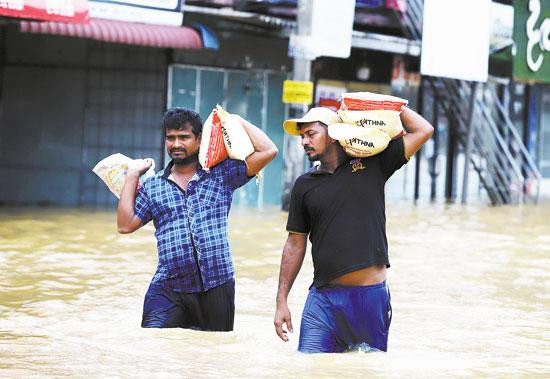 11月29日,在斯里兰卡首都科伦坡郊区,当地居民在遭受洪水侵袭的街道上运送物资。