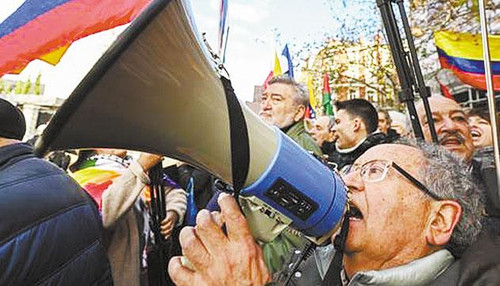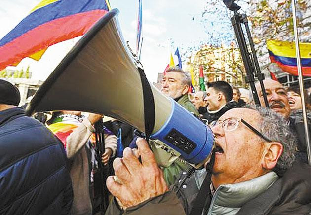 “委内瑞拉,不朽的国度;因为你的坚韧与反抗;世界上所有的人民,都与你同在……”歌声在马德里街道间回荡。秘鲁移民后裔、安第斯传统乐团成员阿尔贝托·卡尔德隆敲着鼓点领唱。