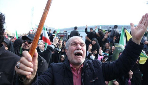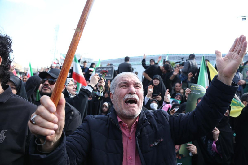 在伊朗首都德黑兰革命广场,民众参加为伊朗伊斯兰革命卫队海军司令坦格西里、伊朗武装部队总参谋长顾问贾姆希德·埃哈基及伊朗武装部队军事人员举行的告别仪式时情绪激动。新华社 发