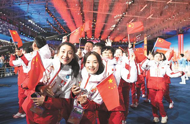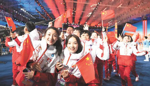 2月7日,中国体育代表团在开幕式上入场。当日,第九届亚洲冬季运动会开幕式在哈尔滨举行。 新华社发