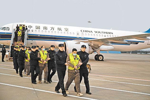 2月20日,随着中国民航包机降落在江苏南京禄口国际机场,缅甸妙瓦底地区的200名中国籍涉诈犯罪嫌疑人,经泰国被我公安机关押解回国。 新华社发