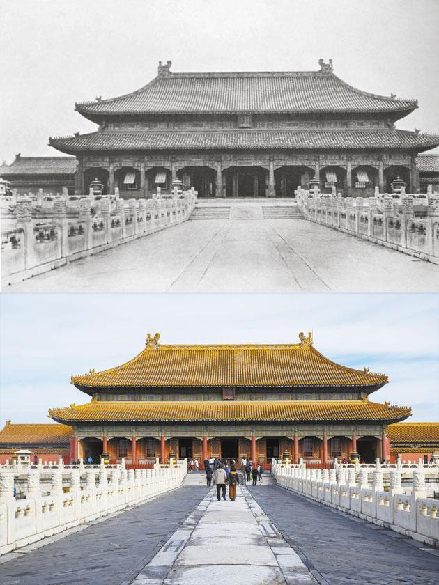 上图为20世纪初拍摄的乾清宫(故宫博物院供图);下图为2025年10月10日拍摄的乾清宫(新华社记者金良快摄)。 新华社发