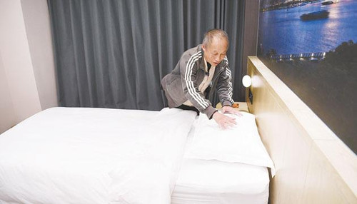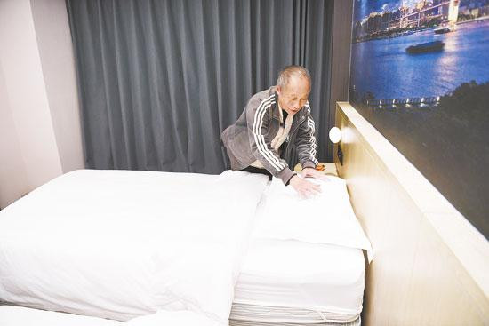 宏福苑居民邝佩麟在粤海酒店“爱心客房”里整理床铺。 新华社发