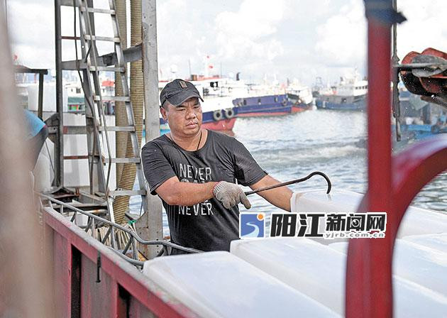 8月16日早上,渔民忙着将冰块送往渔船。