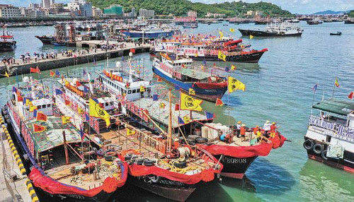 约1300艘渔船从闸坡中心渔港接踵而出,奔赴南海渔场。