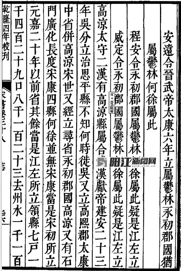 这一结论还可通过宋康郡的设置进一步佐证。《宋书·州郡志》另载:“宋康太守,本高凉西营,文帝元嘉九年立。领县九……石门长,何志故属高凉。”元嘉九年(432),刘宋在高凉郡西部设宋康郡,原属高凉郡的石门县被划归其管辖,且明确称石门为“故属高凉”的旧县,足见其建制早于宋康郡。遗憾的是,部分阳江出版的书籍误将石门县立县时间定为元嘉九年。石门县县治具体在何处?民国《阳江志》载:“石门,即今白石都之石门村,阮《通志》以石门为高州府之石城,未免太远。”此说符合宋康郡诸县均在原阳江县境的地理范围,更为可信。也即石门县在今阳西县上洋镇石门村。