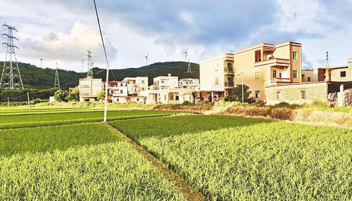 时近黄昏,凉风习习。此地依山面海,风景甚佳。沿着村边干净的大道往里走,发现一道清冽的溪水自村后的山上汩汩而来,让人内心感到异常的清新。夕阳下,村庄的一栋栋楼宇显得立体生动。进到村子里面,从建筑新旧和样式,可辨别前面是新村,后面是旧村。在旧村旁边是一望正在拔节的水稻,青绿可人,村后面的山上,大风车正徐徐转动,好一幅现代新农村的景象。