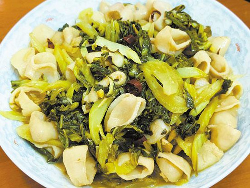 秋冬季节,是种植芥菜的最好时节。记得小时候在农村生活,每当立冬过后芥菜长势最佳时,村里家家户户都会挑个最合适的时机将芥菜收割回来腌制酸菜。然后,整个冬季的餐桌也就少不了酸菜的味道。不过,那时候的酸菜吃法是很简单,通常只是用猪油将洗干净的酸菜翻炒几下再用水煮,但即使是这样简单的“原味”清水煮酸菜,在那个物质还相对匮乏的年代,却也是一道吃不腻的美味。而如今,被称为“农家一宝”的酸菜,更多的是作为配菜与其他食材做出更具特色风味的美味菜肴。