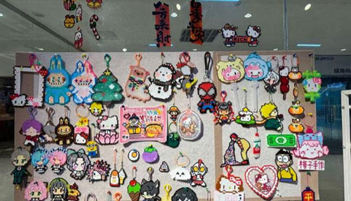 手作店工作人员悦悦介绍,拼豆是以不同规格的彩色塑料颗粒为原料,玩家借助钉板,按照图纸或自主创意排布图案,再通过加热工具将颗粒热熔定型,最终制成钥匙扣、冰箱贴、摆件、挂件等各类文创作品的DIY手工。“周末店里基本座无虚席,很多顾客都会提前预约。目前店里有多款图纸,涵盖动漫、游戏、本地文化等多个系列,还能提供私人定制服务,满足不同顾客的需求。”她补充道。