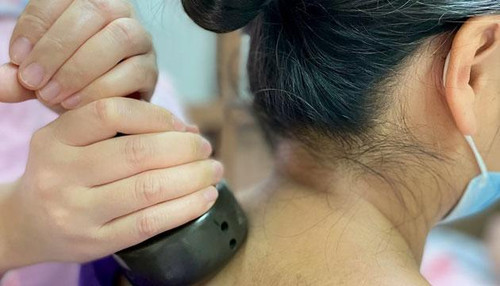 医生通过刮痧调理患者肩颈不适。