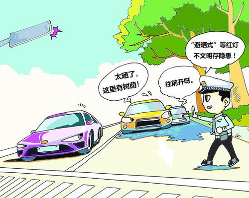 炎炎夏日,在市区十字路口的红绿灯前,有些司机习惯把车停在树荫下的道路上等红灯变绿后通行。