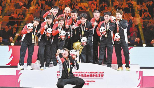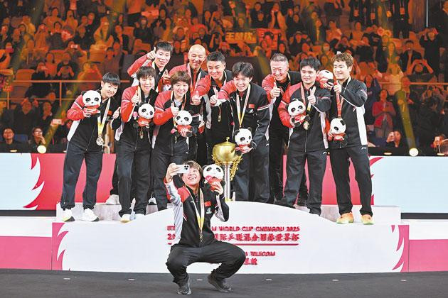 新华社成都12月7日电(记者/陈地 边思琪)7日晚,2025国际乒联混合团体世界杯迎来决赛。中国队以8:1大胜日本队,以11战全胜战绩实现“三连冠”。