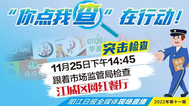 为进一步提升餐饮环节食品安全管理水平,助力阳江市创建广东省食品安全示范城市,阳江市市场监督管理局江城分局联合阳江日报全媒体开展“你点我查”活动,邀请人大代表和政协委员抽点网红餐厅进行突击检查,直击餐饮行业食品安全管理规范落实情况,全程网络直播。直播时间:11月25日14:45--16:45