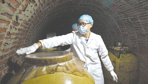 朱杰文在酒窖中查看酒缸密封状况。 林娜娇 摄