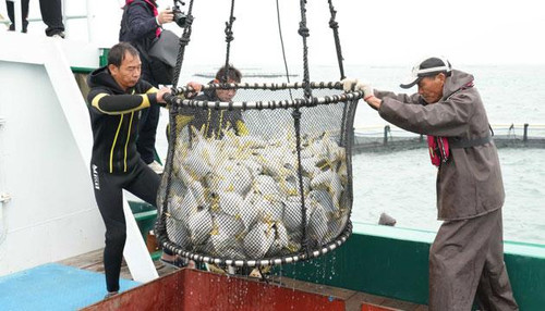 工作人员将捕捞上的金鲳鱼转运至船上。 袁荣泽 摄